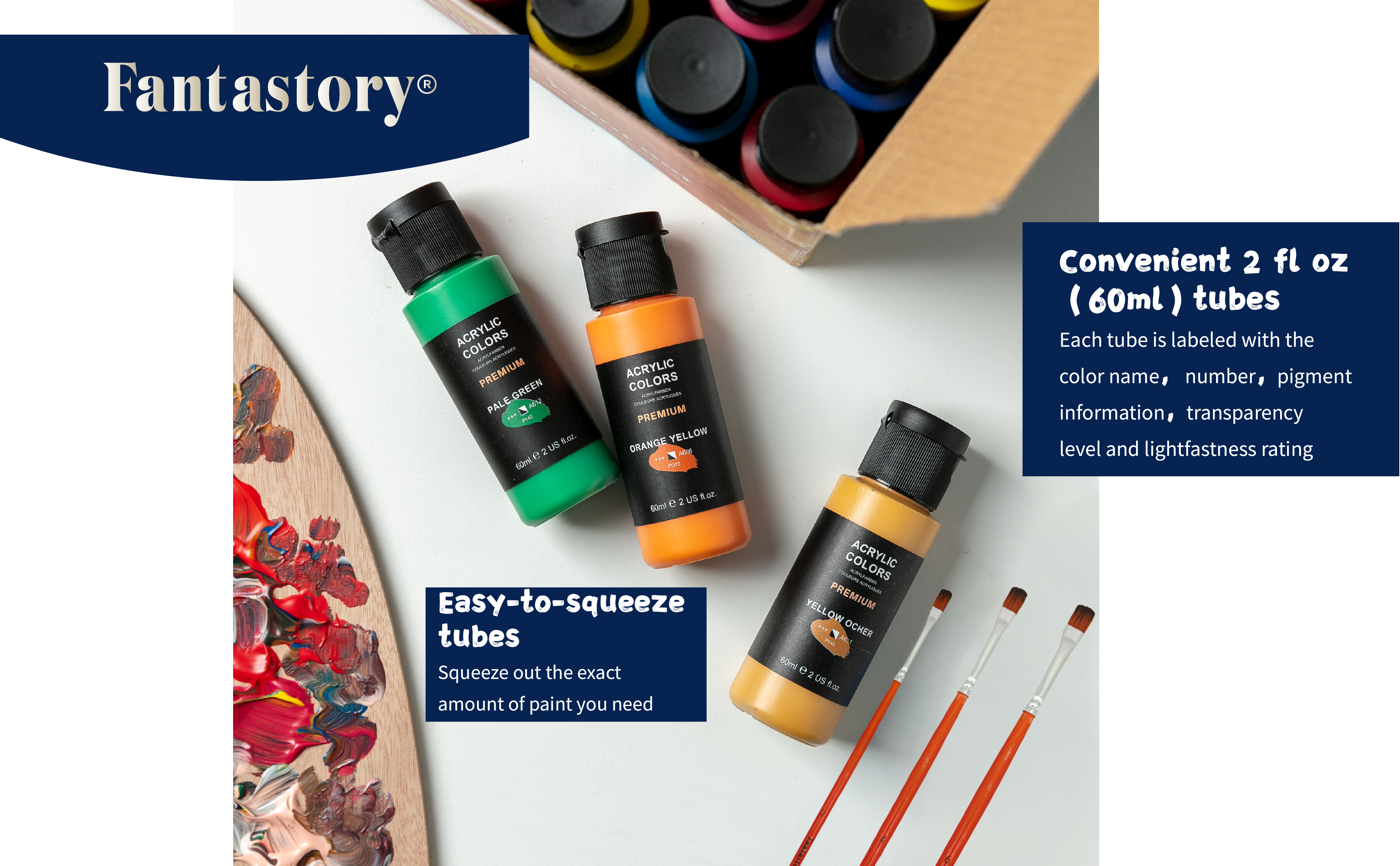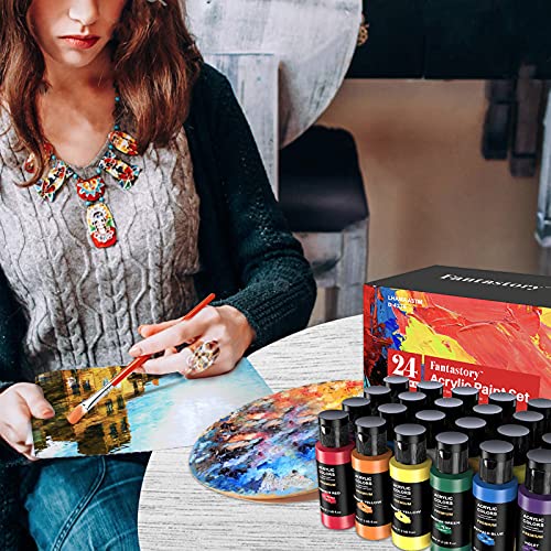 Fantastory Acrylic Paint Set, 24 Classic Colors(2oz/60ml), Professional Craft Paint, Art Supplies Kit for Adults & Kids, Canvas/Fabric/Rock/Glass/Stone/Ceramic/Model/Wood Painting with 3 Brushes