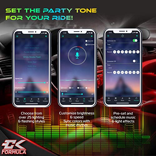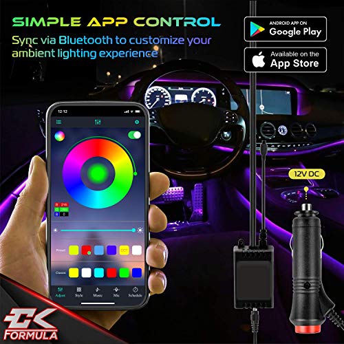 CK Formula Interior Car Lights, LED Light Strips for Cars, 16 Million RGB Colors, Bluetooth App Control, Music Sync Under Lighting Dashboard, Waterproof IP68 Rating, 12V DC Charger, 4pcs