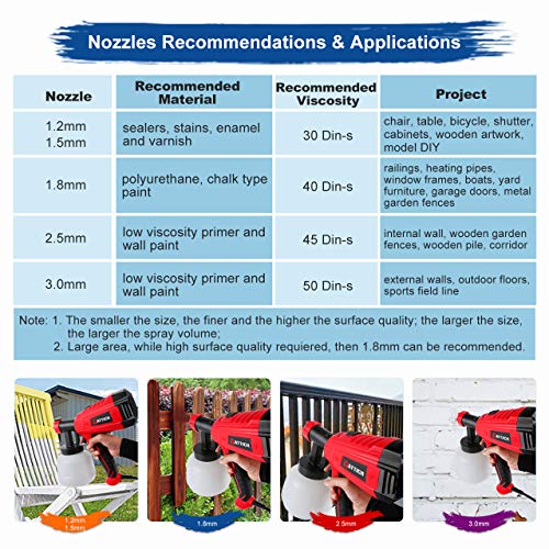 【3 Spray Patterns & 5 Nozzle Sizes】Paint sprayer can be adjusted to 3 different spray patterns: horizontal, vertical and circular, and equipped with 5 size nozzles (1.2mm/1.5mm/1.8mm/2.5mm/3.0mm) for any painting projects, such as furniture, cars, fences, interior walls, garage doors, garden tables and chairs etc.